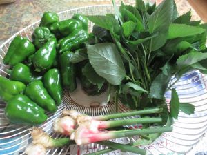 朝一番で作業場にある畑で、野菜を取ってきました。 今日の収穫です。モロヘイヤは朝の味噌汁にします。お昼頃になるとすっかり萎えてしまいます。 -