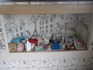 事務所のこの場所は頂いたお花を飾る指定席です。 出窓の下の空間を生かしクロスを貼り置き物の場所としました。気分は最高 -